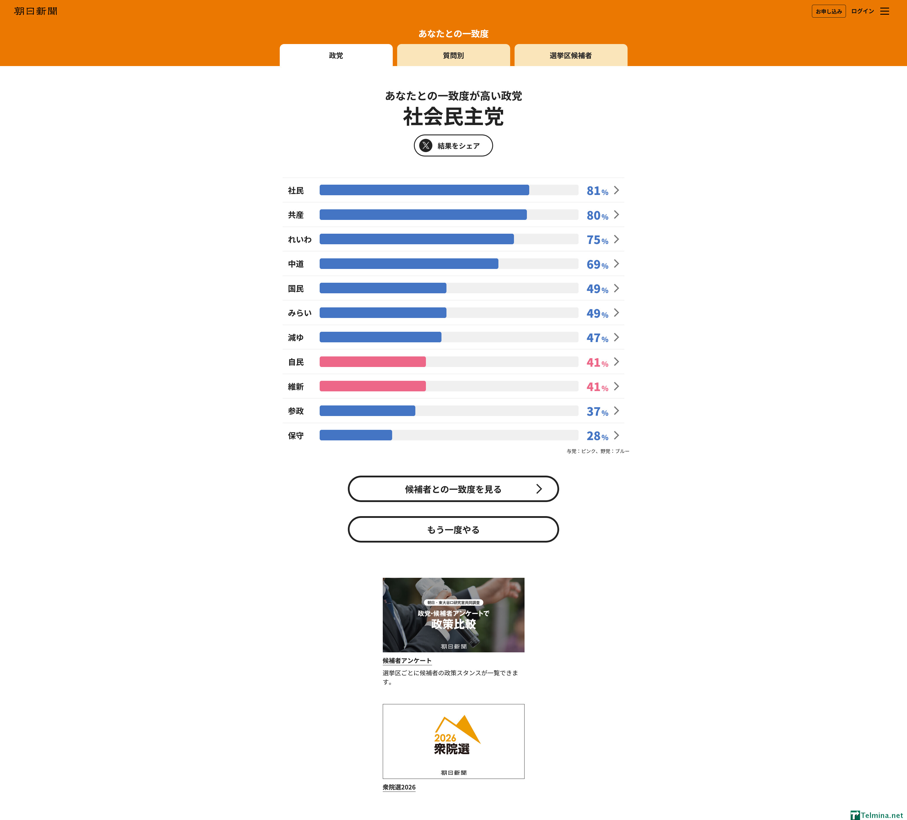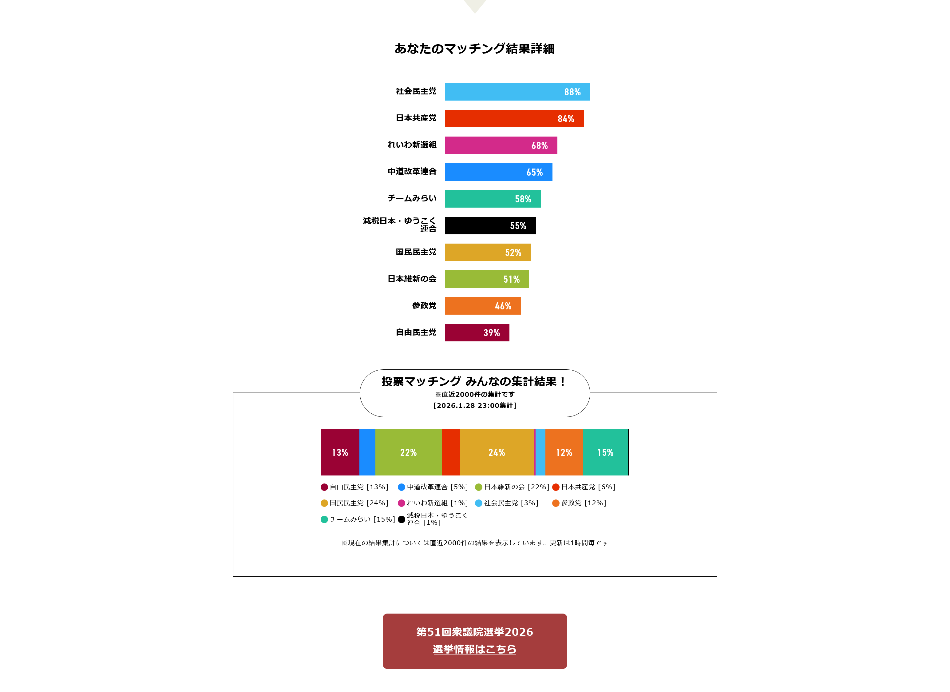 社民党以外では、共産、れいわ、中道がマッチング上位に来ています。国民、みらい以下は50%を切っており、保守と参政が最低レベルとなっています。
